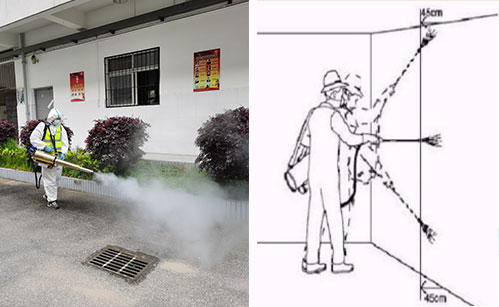 噴霧技術(shù):掛流狀態(tài); 1、橫向噴灑幅度為75 cm; 2、左右幅度間應(yīng)有5 cm的重疊; 3、自上向下噴灑; 4、首先自上向下噴灑,結(jié)束一個(gè)噴灌噴 灑幅度 后,順時(shí)針橫移,開(kāi)始下一個(gè)幅度噴灑; 5、保持噴嘴距離墻面45 cm; 6、開(kāi)始噴灑時(shí)首先向前傾斜,當(dāng)噴嘴向下噴灑時(shí),身體向后傾斜; 7、自時(shí)口順時(shí)針操作,直至房間處理完畢; 8、對(duì)人體接觸較多的柜臺(tái)、桌椅、門把手、水龍頭等可用0.2%-0.5%過(guò)氧乙酸溶液或有效氯為500mg/L-1000mg/L的二氧化氯消毒劑進(jìn)行噴灑或擦拭消毒,作用時(shí)間15-30分鐘。